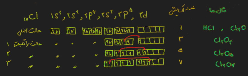 برای مثال حالت های اصلی و برانگیخته آرایش الکترونی عنصر کلر و درجات اکسایش مختلف آن را ببینید:
