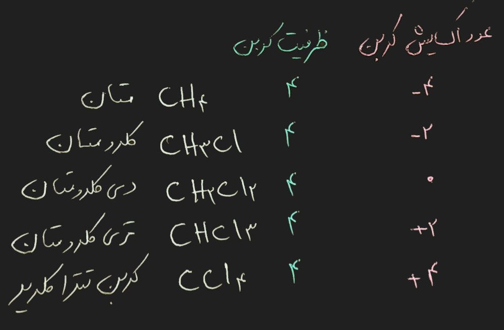 در این مقاله به طور جداگانه ظرفیت و عدد اکسایش را تعریف کردیم. برای این که تفاوت این دو را بهتر یاد بگیرید به ظرفیت و عدد اکسایش کربن در ترکیبات زیر دقت کنید: