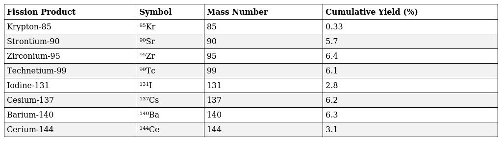 • ایزوتوپ ⁹⁰Sr (استرانسیم-90): نیمه عمر طولانی (29 سال)، جستجوی استخوان، در صورت بلعیده شدن، خطر سلامتی طولانی مدتی را به همراه دارد.
