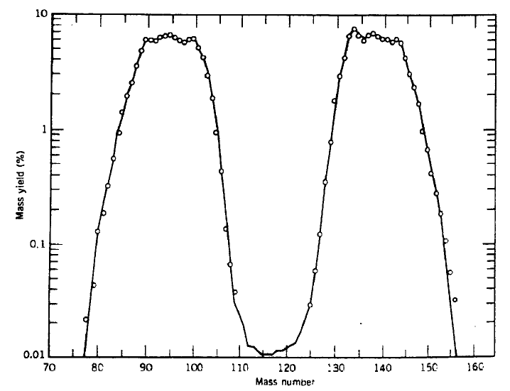 منحنی بازده جرم برای شکافت نوترون حرارتی ²³⁵U شکل مشخصی دارد: