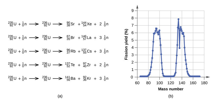 شکل بالا: (a) شکافت هسته ای U-235 طیفی از محصولات شکافت را تولید می کند. (b) محصولات شکافت بزرگتر اورانیوم U-235 معمولاً یک ایزوتوپ با عدد جرمی حدود 85-105 و ایزوتوپ دیگر با عدد جرمی حدود 50٪ بزرگتر است، یعنی حدود 130-150.