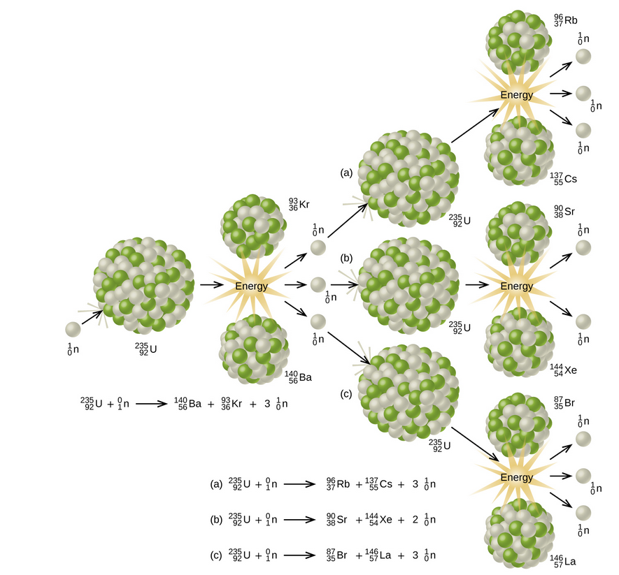 شکافت یک هسته بزرگ، مانند U-235، دو یا سه نوترون تولید می کند که هر یک از این نوترون ها می توانند مطابق واکنش های نشان داده شده، باعث شکافت هسته دیگری شوند. اگر این روند ادامه یابد، یک واکنش زنجیره ای هسته ای رخ می دهد.