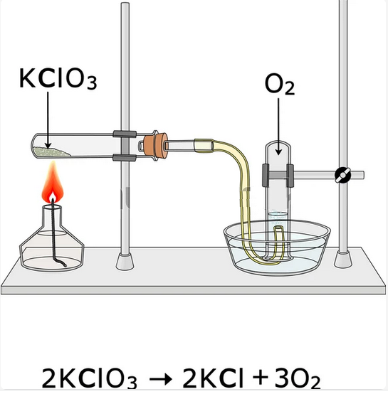 • تجزیه پتاسیم کلرات (KClO₃): این یک روش آزمایشگاهی کلاسیک است. هنگامی که پتاسیم کلرات در حضور کاتالیزور (معمولاً دیاکسید منگنز، MnO₂) به شدت گرم میشود، پتاسیم کلرات تجزیه میشود و گاز اکسیژن و پتاسیم کلرید (KCl) تولید میکند.