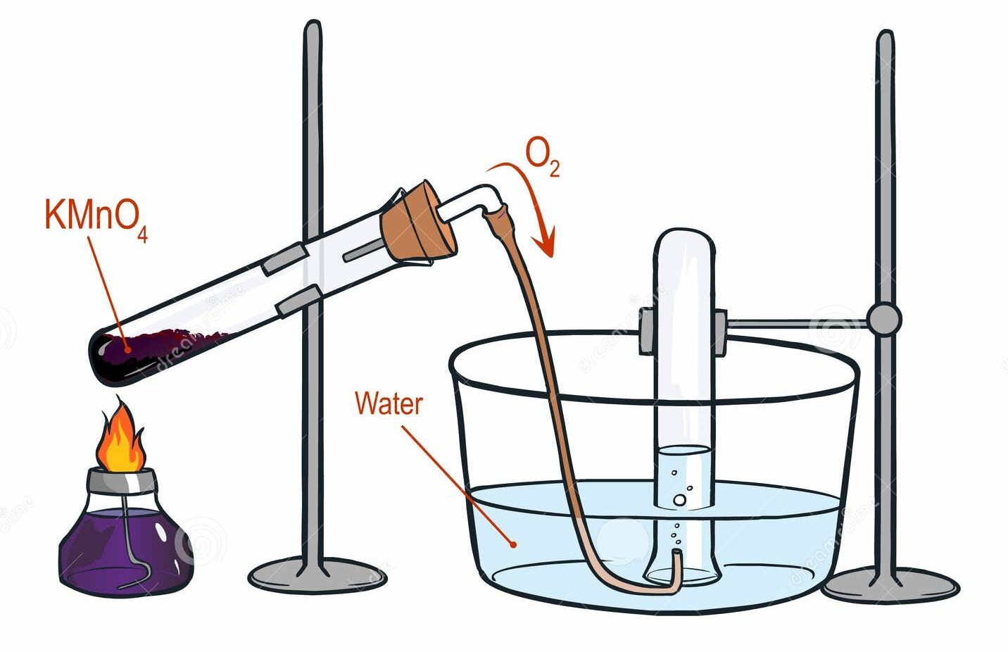 * توجه: دیاکسید منگنز به عنوان کاتالیزور عمل میکند و واکنش را سرعت میبخشد اما در فرآیند مصرف نمیشود. گرم کردن پتاسیم کلرات بدون کاتالیزور میتواند خطرناک باشد و منجر به تجزیه کنترل نشده شود. • تجزیه پرمنگنات پتاسیم (KMnO₄): حرارت دادن پرمنگنات پتاسیم، همراه با دی اکسید منگنز و منگنات پتاسیم، اکسیژن نیز تولید میکند.
