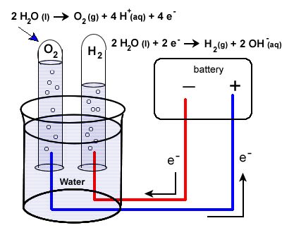 • عبور جریان الکتریکی از آب باعث تجزیه آن به گاز هیدروژن در کاتد (الکترود منفی) و گاز اکسیژن در آند (الکترود مثبت) میشود.