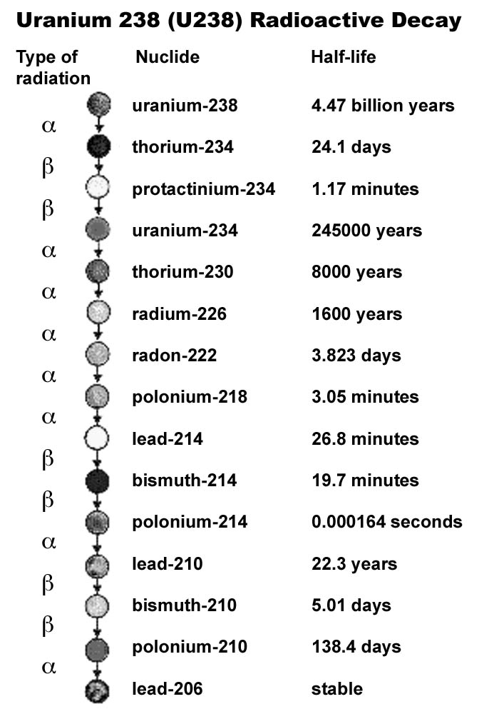 در شکل زیر مراحل فروپاشی اورانیم-238 تا رسیدن به عنصر پایدار سرب-206 را می بینید: