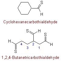 استفاده از «تیو» و «آلدهید» در مولکول های ساده، مانند «تیوبنزالدهید» (C6H5-CHS) همچنان متداول است، اما نامگذاری قواعد آیاپاک به طور کلی ترجیح داده میشود.